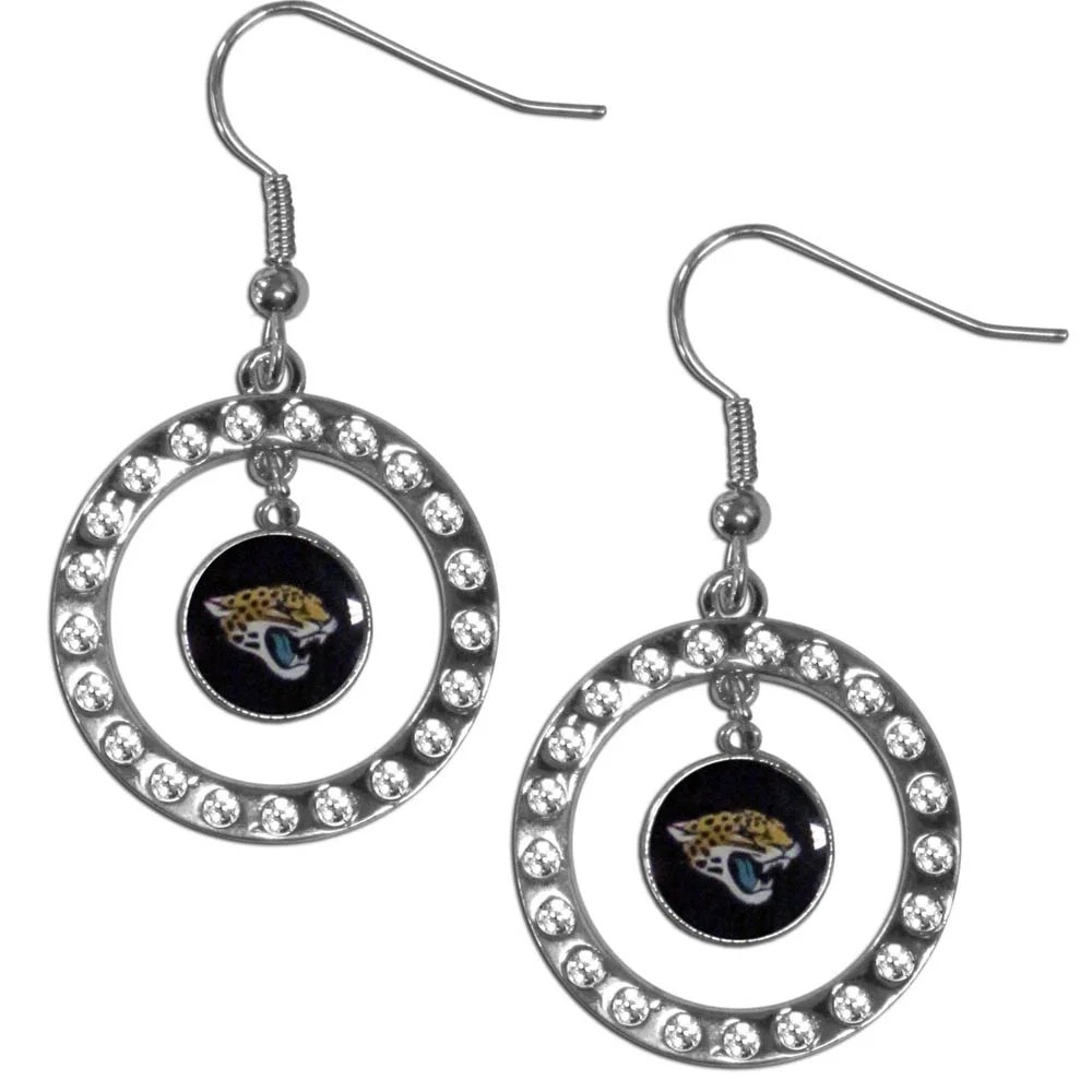 Our officially licensed rhinestone hoop earrings comes on an hypo-allergenic fishhook posts and features a hoop covered in rhinestones with a high polish chrome finish and a Jacksonville Jaguars logo dangling in the center.